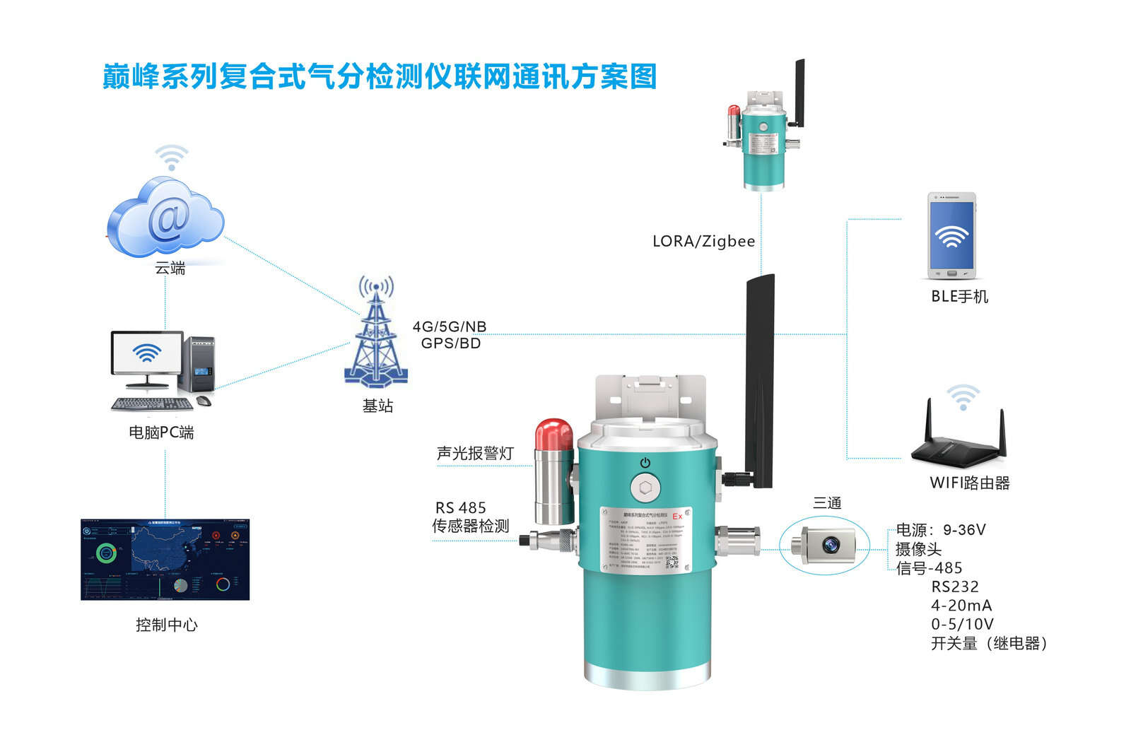 巔峰系列復(fù)合型氣分檢測儀是安帕爾公司根據(jù)客戶市場需求和多年行業(yè)應(yīng)用經(jīng)驗(yàn)推出的一款高端復(fù)合型固定式氣分檢測儀。為了滿足客戶價(jià)格需求同樣有定位通用款和專用款兩個(gè)版本,專用款是結(jié)合客戶應(yīng)用場景及需求專業(yè)定制,產(chǎn)品更專業(yè)更可靠。其主要功能是:將現(xiàn)場檢測到所有參數(shù)(包括氣體、溫濕度、紫外、光照、甚至水質(zhì)等),轉(zhuǎn)換為對應(yīng)的標(biāo)準(zhǔn)信號(標(biāo)準(zhǔn)信號種類選擇請參考技術(shù)參數(shù)表),然后將信號傳輸?shù)?/font>PLC、DCS、報(bào)警控制主機(jī)等上位機(jī)或直接通過無線信號進(jìn)入到公司互聯(lián)網(wǎng)管控平臺進(jìn)行統(tǒng)顯示管理和控制,從而組成功能強(qiáng)大的智能化檢測報(bào)警控制系統(tǒng)。巔峰系列復(fù)合氣分檢測儀產(chǎn)品采用一體化設(shè)計(jì),支持?jǐn)U散和泵吸兩種采樣方式,可實(shí)時(shí)檢測可燃,有毒有害氣體,擴(kuò)散檢測最大可支持5參數(shù)檢測,泵吸檢測最大可支持10參數(shù)檢測,擴(kuò)散式采樣檢測擁有IP68防護(hù)能力,產(chǎn)品本安+隔爆雙防爆設(shè)計(jì),內(nèi)置繼電器,可控制外圍聲光報(bào)等器、風(fēng)機(jī)、電磁閥等設(shè)備,支持定位、水位檢測、溫濕度檢測、語音播報(bào)功能、視頻拍照、防拆震動/傾角檢測等功能選配。設(shè)備連入安帕爾服務(wù)器,可實(shí)現(xiàn)遠(yuǎn)程監(jiān)測、遠(yuǎn)程設(shè)置報(bào)警值和遠(yuǎn)程標(biāo)定等功能,該系列產(chǎn)品基本適用干任何領(lǐng)域和行業(yè)。